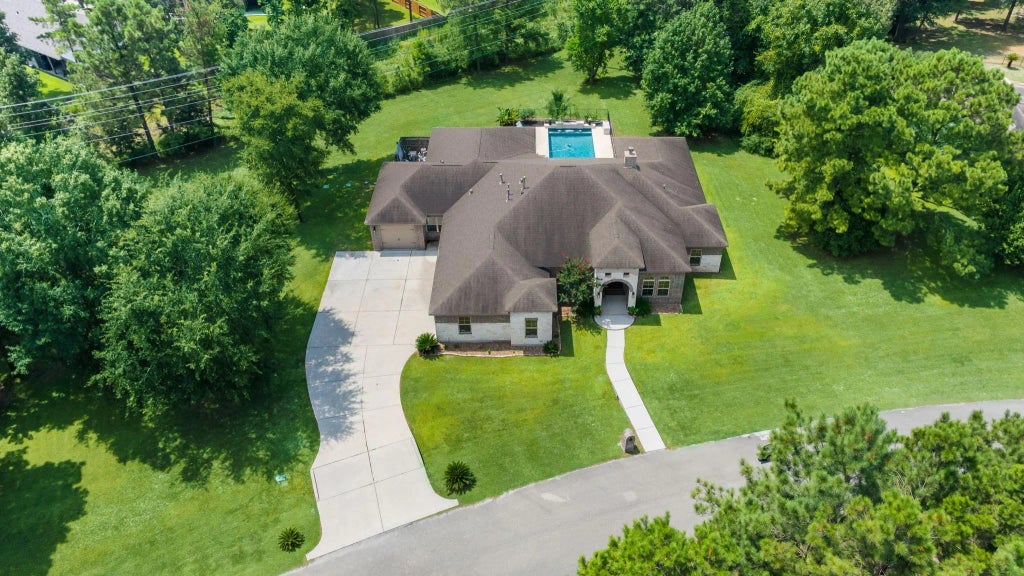 Set on a spacious 1.2-acre lot, home offers perfect balance of comfort, functionality, outdoor enjoyment. Inviting entryway finds a dedicated home office and formal dining room. Open-concept living area cozy gas fireplace and large windows that bring in natural light. Kitchen built for everyday living/entertaining, w/granite countertops, large island, breakfast bar, custom cabinets. Primary suite privately tucked away w/large windows overlooking the pool. Ensuite bath w/separate dual sinks, soaking tub, walk-in shower, two separate closets. Enjoy your own personal getaway w/sparkling pool, waterfall feature, stamped concrete patio, covered outdoor space perfect for relaxing/hosting friends. Room to build a workshop, RV garage, etc. Smart layout includes two addt'l bedrooms and flexible media room option as 5th bedroom. Golf cart access to Woodforest. Home offers the space you need—inside and out. Easy access to I-45, Aggie Expressway, The Woodlands, and more!