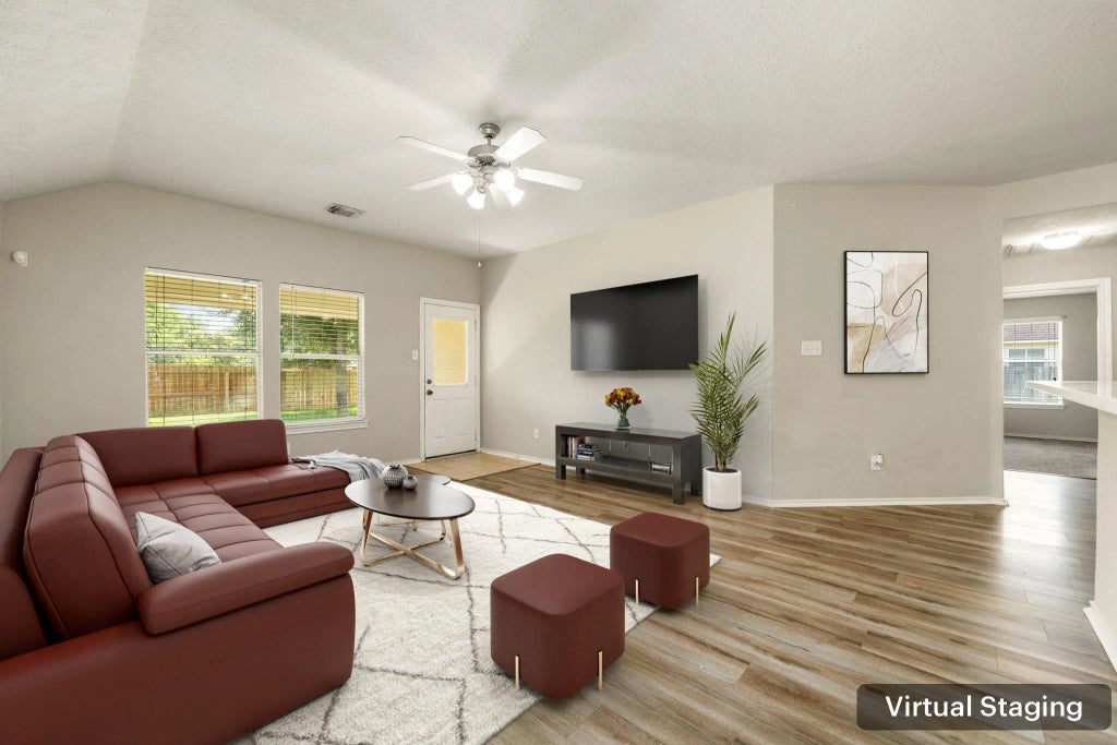 Rare privacy meets stylish updates in this stunning home—set beside open green space w/ no neighbors on one side! Enjoy a bright & airy layout w/ brand-new flooring through the entry, dining, living, hallways & primary suite. The gourmet kitchen shines w/ quartz counters, breakfast bar & plentiful cabinets, opening seamlessly to the spacious living/dining area—ideal for hosting or everyday living. Flexible dining room easily doubles as a study. Oversized laundry fits full-size washer/dryer plus storage. Relax in the king-sized primary suite featuring a spa-style bath w/ garden tub, separate shower & walk-in closet. Extra-large coat closet adds convenience. Located in a quiet, established neighborhood w/ quick I-45 access, close to shopping, dining & parks—plus an amazing community center offering pool, splash pad & park for endless fun! Two-car garage & charming curb appeal make this move-in ready beauty a standout!