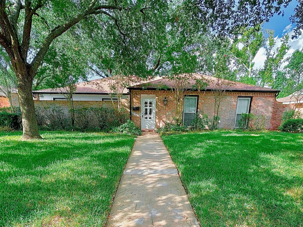 Four bedroom home in Briargrove Park with updated kitchen and bathrooms. Kitchen includes glass front cabinetry and modern finishes. Hardwood floors throughout the main living areas. Primary suite features a renovated bath with walk-in shower and updated fixtures. Additional bedrooms share updated secondary baths. Private courtyard at the front entry provides an outdoor sitting area. Backyard is landscaped with mature trees and greenery, surrounding a pool and spa. Gas light at front entry.