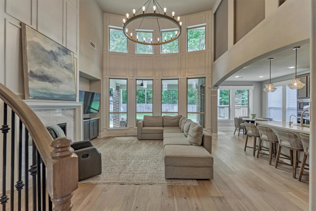 Nestled on a cul-de-sac lot with no back neighbors (greenbelt lot) in the sought-after Bronze Trace section of Woodforest, this stunning home features over $75K in designer upgrades. Inside boasts wide plank French oak floors, custom trim, vanities, and window treatments. The chef’s kitchen opens to a spacious living area with floor-to-ceiling windows. The main floor includes a study, formal dining, powder bath, and luxurious primary suite with a large closet connected to the laundry room. Upstairs offers 3 bedrooms, 2 baths, a game room, and media room—one bedroom with an ensuite, perfect for guests. The backyard is an entertainer’s dream with extended stamped concrete patio, turf insert, custom putting green, and limestone bordered flower beds. Enjoy living walking distance to 3 parks and a dog park, plus Woodforest amenities: pools, courts, splash pad, and Pine Market shops. All easily accessible by golf cart!