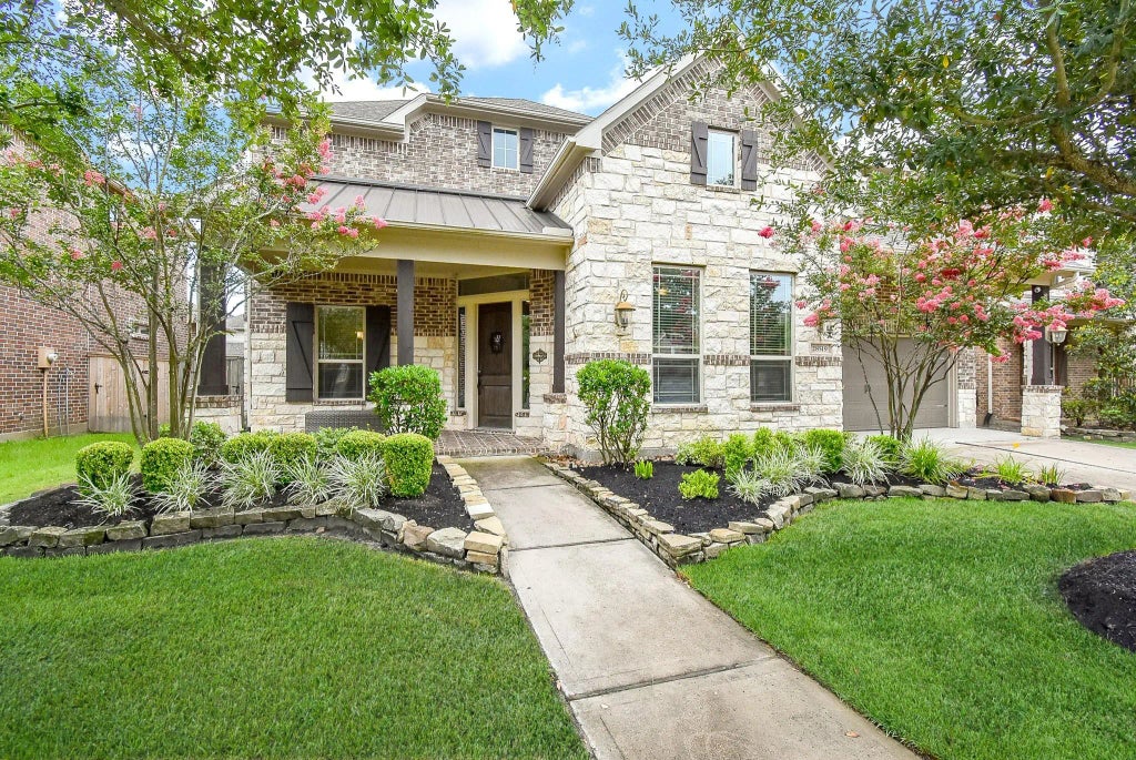 Stunning 5 bedroom, 3.1 bath home on a Cul de sac in desirable Cinco Ranch Southwest. Gorgeous curb appeal with brick and stone elevation. Relax on your front porch with wood pillars and gaze out over the lush landscape and mature trees. Home includes many custom features with arched doorways, coffered ceilings, stately wood beams, art niches and many built-ins. Beautiful wood flooring throughout most common areas. Kitchen is a Chef's dream with huge island, double ovens under cabinet lighting, pot filler, crushed Granite sink and a 5-burner gas stove top. The primary has high ceilings, wood flooring and bathroom with separate shower and bath, two sinks and two closets. Upstairs all the 4 secondary bedrooms have wainscoting, media room with screen which conveys, and an upstairs built in study nook. Outdoor resort style pool, deck and patio area is great for entertaining along with the outdoor kitchen, covered patio with TV mount and large sitting area.