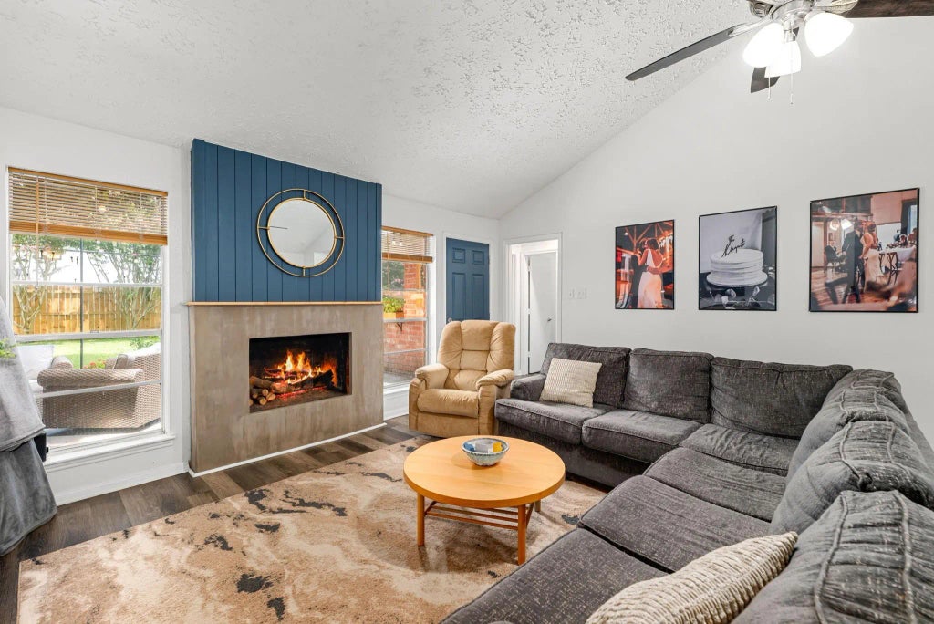 Charming SINGLE story home in the established Fairfax community offers a spacious, light-filled layout w/ tasteful upgrades throughout! Step inside to vaulted ceilings, fresh paint, updated luxury vinyl flooring & modern updated wood burning fireplace. The kitchen shines w/ granite counters, subway tile backsplash, painted cabinets & black appliances. Formal dining could flex as a home office. Split floorplan offers privacy w/ a LARGE primary suite featuring a walk-in closet, open vanity w/ granite, & a tiled shower. Secondary bedrooms are generously sized w/ an updated shared bath. Outside, enjoy a HUGE NEWLY FENCED yard w/ mature shade trees, fresh sod, upgraded fencing, patio w/ TV mount, & bonus storage shed. Full-size garage, great curb appeal & minutes to I-45, Exxon Campus, shopping, dining & Bush IAH. Move-in ready w/ classic charm & updates in all the right places!