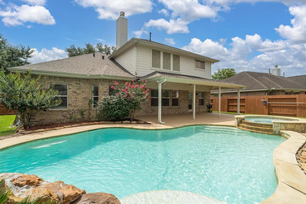Welcome to your dream home in the sought-after Brittany Lakes subdivision! Tucked away on a cul-de-sac near a community playground, this 4 bedroom, 3.5 bath beauty offers a thoughtful layout with the primary suite and private office on the main level, plus a formal dining room. Upstairs, you’ll find the remaining bedrooms plus a game room, providing ideal separation of space. Step outside to your private retreat with a lushly landscaped yard, a large covered patio with three ceiling fans, and a sparkling saltwater pool and spa with waterfall. Recent updates include fresh interior paint, pool/spa lighting and spa blower (2025), epoxy garage floor (2025), carpet (2024), shower door (2024), patio repaint (2024), water heater (2024), roof (2023), and AC (2021). Centrally located with quick access to I-45, shopping, dining, and entertainment, this home combines modern updates with resort-style living!