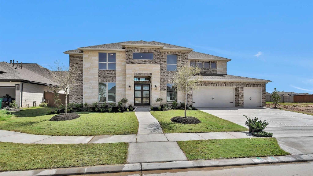 READY FOR MOVE-IN! Two-story double front door entry highlights curved staircase. Home office and formal dining room frame entry. Two-story family room opens to island kitchen and morning area. Kitchen features two wall ovens, 5-burner gas cooktop, walk-in pantry and Butler's pantry. Family room features Wood mantel fireplace and wall of windows. First-floor primary suite includes bedroom with curved wall of windows. Dual vanities, freestanding tub, separate glass-enclosed shower and two walk-in closets in primary bath. First-floor guest suite includes private bath. Upstairs highlights a game room, theatre room and Hollywood bath. Abundant storage space adds to this generous five-bedroom home. Extended covered backyard patio. Four-car garage with porte-cochere.
