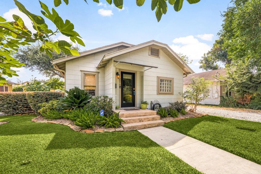 This charming bungalow located in Greater Heights blends classic character with modern updates. The galley-style kitchen with breakfast area opens to a uniquely designed covered porch, complete with outdoor lighting —perfect for entertaining. The primary suite features a private ensuite bath, joined by two additional bedrooms served by a full updated bath. Original hardwood flooring and elegant crown molding flows throughout the brightly painted interior. Step outside to a colorful, low-maintenance landscape designed to attract butterflies and hummingbirds, with a spice garden and flagstone walkways. Additional highlights include an oversized insulated garage, security system, and outdoor speakers. Major improvements include updated electrical, PEX plumbing, redone hardwoods, sewer line replacement, newer fencing, and attic storage. Ideally located less than 5 miles from downtown Houston in a picturesque neighborhood with mature trees and timeless curb appeal.