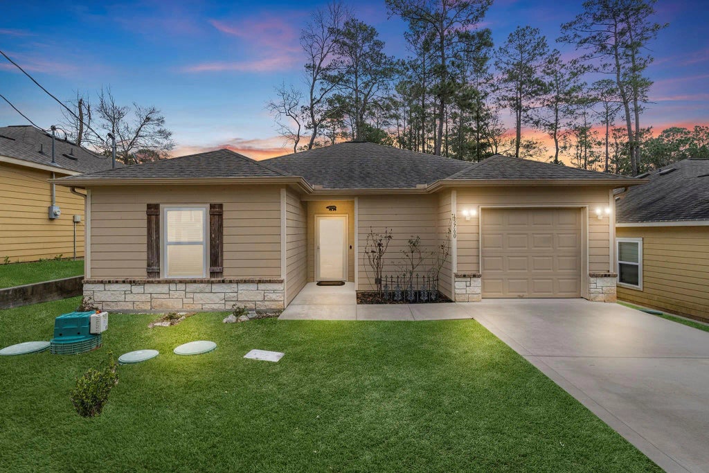 Step into this charming, moving-in ready, single-story home featuring immaculate hard surface floors and elegant recessed lighting. The open-concept layout leads to a stylish kitchen with dark cabinetry, stunning granite countertops, and a cozy breakfast nook. Refrigerator can stay with the home! The fully fenced backyard is beautifully maintained, complete with a covered patio—perfect for outdoor entertaining. The private primary suite boasts high ceilings, a ceiling fan, a walk-in closet, and an en-suite bath with a shower/tub combo. This home is located in a quaint community with private lake access and a community pool.