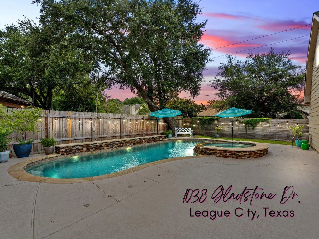 Welcome to 1038 Gladstone Dr. - a place where comfort meets charm in the heart of League City, tucked inside the gated neighborhood of Wilshire Place. This lovingly maintained 4-bedroom, 3.5-bath home in Clear Creek ISD offers 3,437 sq ft of thoughtful design, featuring a downstairs primary suite, an expansive upstairs game room, and a second upstairs primary retreat—ideal for multi-generational living. The heart of the home shines with granite countertops, crown molding, and beautiful LVP and tile flooring. Step outside to your own private paradise with a sparkling pool and oversized spa (2018)—ideal for entertaining and making memories! The finished/detached 2.5 car garage features A/C, heat, and a flexible upstairs space (26x13) that is perfect as a home gym, game room, or work from home office. With a new roof installed in 2023, this move-in ready home offers peace of mind and lasting value. Schedule your private tour today and see all that this home has to offer!