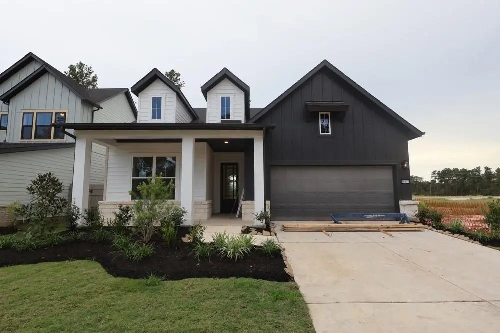 This stunning new single-story home by David Weekley Homes in Artavia features 4 bedrooms, 3 bathrooms, and an office, offering both style and functionality. With numerous upgrades throughout, this home is designed for modern living. The open floor plan includes a spacious living area, with sliding glass doors that lead to a covered porch, perfect for outdoor relaxation. The gorgeous front porch, complemented by a modern farmhouse exterior, enhances the home's curb appeal. The luxurious owner's bathroom is a true retreat, featuring a freestanding tub for a spa-like experience