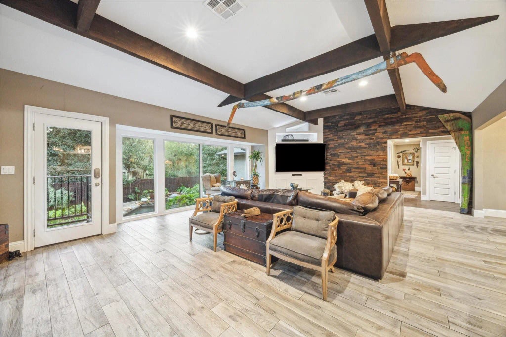 Situated on a peaceful private road with NO HOA or Restrictions, this renovated modern-ranch home offers 2,747 sqft *Per Seller*, 4 BR, 2.5 baths, and an additional 22x20 bonus room that can serve as a media room. The open and flowing floor plan encompasses a spacious kitchen island, butler's pantry, granite countertops, stylish backsplash, custom wood cabinetry and beams, stainless steel appliances, double pane windows, fireplace, recessed lighting, tile flooring, and more. The family room's picture windows overlook the backyard oasis with a resort-style beach entry pool that creates a beach-like atmosphere, and the patio has a water mister for those hot summer days. The extended driveway accommodates 12 cars. The raised foundation provides an entire storage and recreation space underneath the home. Located a few miles from Bellaire HS, The Galleria, Reliant Stadium, The Medical Center, and Downtown Houston. Brays Bayou trails are only blocks away.