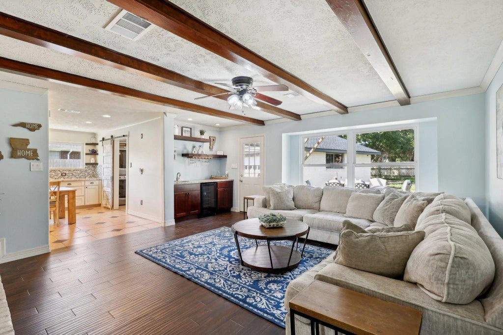 Welcome to this beautifully renovated ranch-style home, perfectly positioned in the heart of Friendswood on a quiet cul-de-sac. Offering 4–5 spacious bedrooms, 2.5 baths, and a flexible floor plan, this home combines comfort, functionality, and modern style. The main living area features warm exposed beams and flows effortlessly into a contemporary kitchen with granite countertops—perfect for both everyday living and entertaining. Recently updated in 2025, both bathrooms showcase stylish new tile finishes. Energy-efficient windows and a new roof installed in 2024 provide peace of mind and long-term value. Step outside to enjoy a large backyard with an extended patio, ideal for outdoor gatherings. There’s also additional parking—perfect for a boat, RV, or multiple vehicles. Flood insurance is transferable, adding an extra layer of convenience. Move-in ready and full of charm, this home is a rare opportunity in highly sought-after FISD. Schedule your tour today!