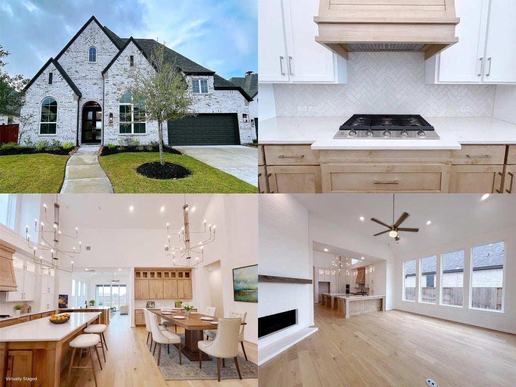 Take a tour of this exquisite home from double door entry to Texas size patio with gas hookup and no back neighbors ideal for hosting. The Farmhouse kitchen with combined dining area showcases soaring 20ft ceilings, large dining hutch with tons of storage, stainless Electrolux appliances, statement chandeliers and cabinets to ceiling with glass doors and lights. Unwind in your luxurious grand primary bedroom, complete with a freestanding tub and vanity area. Fireplace for added ambiance and ensuite bath in every room for ultimate privacy. Don't miss tankless water heater in 3car tandem garage with plenty of room for storage. Refrigerator, washer and dryer included. This home is Smart Home and Energy Star rated!!!
