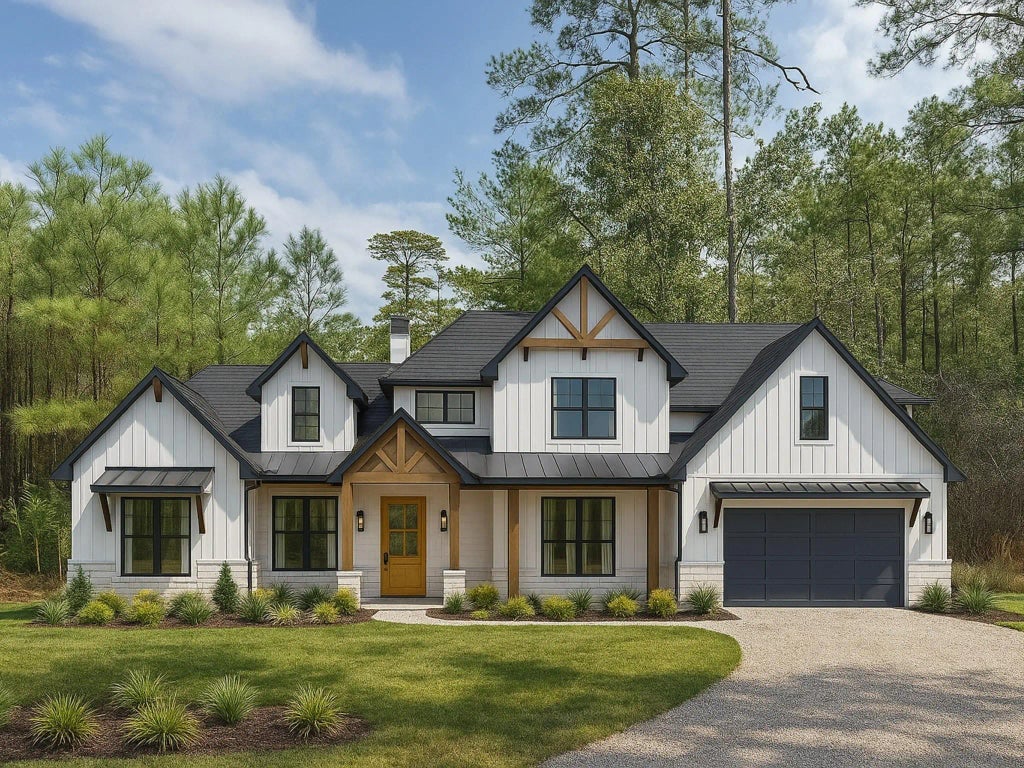 Imagine stepping onto this very spot at 15886 Wood Grove Way in Republic Grand Ranch, Willis, TX. With its existing blend of mature pine trees and natural landscape, this 2-acre parcel offers the perfect backdrop for a stunning, contemporary farmhouse. Picture a sleek, two-story modern farmhouse gracefully set back from the road, utilizing the natural rise of the land for an impressive approach. The home features a classic white board-and-batten siding, accented with dark, contrasting trim around large, black-framed windows that invite an abundance of natural light and frame views of the surrounding trees. A standing-seam black metal roof adds to the modern aesthetic, while a substantial, wrap-around front porch, crafted from natural wood with simple, clean-lined railings, provides a welcoming entry and ample space for outdoor living. Can you envision your life and dream home in the heart of Republic Grand Ranch? If so reach out today and immediately start making your dreams a reality!