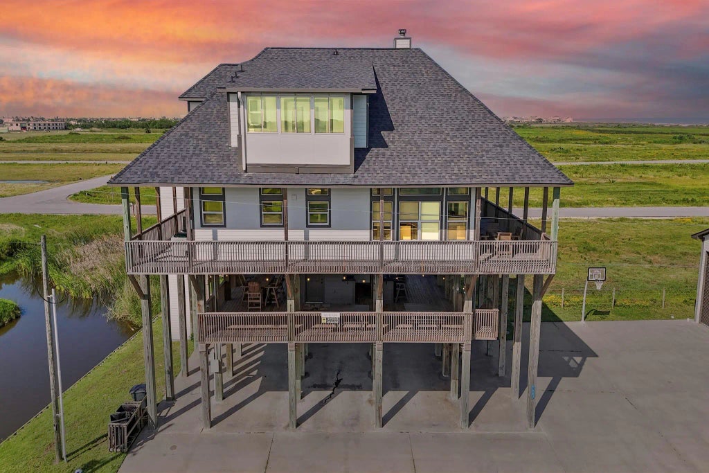 Grab your favorite swimsuit and sandy beach vibes and head on down to Bolivar Peninsula to view this beach villa. The very best views on the peninsula from every vantage point throughout the home. Enter from your retractable staircase onto the mezzanine level deck with wrap around bar top, sink, kitchenette and half bath. The beach breeze is constant as your views of the gulf are pristine. There is 2200+ square feet of perfectly laid out living space that sleeps over 20+ and offers a Texas sized eat-in kitchen. Freshly painted and decorated with light and bright colors. RV space with 50 Amp hook up and oversized garage to store a boat or build a new home having two income producing properties or sell one to help pay for the other. The electric lift helps get groceries and luggage to appropriate levels. Home was built above todays standards. Lots of ongoing development with a future Peninsula Beach Resort close by. Currently an income producing vacation rental! Call for private showing.