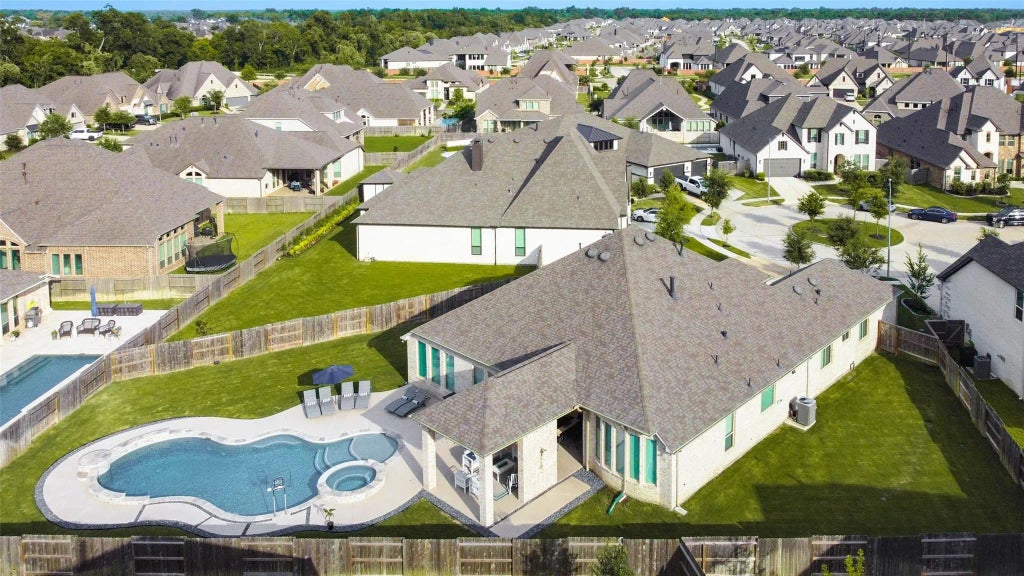 RARE FIND! **ONE STORY** 4-5 BEDROOM 3.5 BATH 3 CAR GARAGE (5ft EXT) **POOL/SPA** EXTENDED COVERED PATIO ALL NESTLED ON A MASSIVE 15,000 SQ FT+ CUL DE SAC LOT! This home features a grand entry w/double glass french door study. Stunning wood look Isle kitchen (lowers & island) w/double stacked white cabinetry uppers, 6 burner Cafe gas range, double ovens, huge walk in pantry, custom pendant lighting & large breakfast area. Family room just off the kitchen w/ gas log fireplace framed by beautiful built in shelving/cabinetry. Fabulous game room w/dry bar area. Spacious primary suite w/ensuite bath & enormous "Texas Sized" walk-in closet. 3 large secondary bedrooms one ensuite & the other shares a Jack and Jill bath. Backyard paradise w/huge pool/spa/patio/outdoor TV/speakers & built in outdoor shower. Vast side yard on both sides of the home. Easy access to Westpark Tollway leading to Shopping/Dining & access to the energy corridor. Zoned to excellent LCISD Schools. Never Flooded!