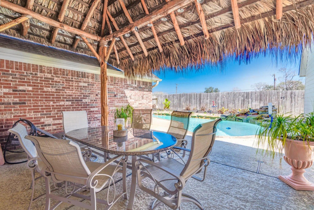Fantastic one-story home with FINISHED GARAGE APARTMENT WITH FULL BATH, and four bedrooms inside a gorgeous split-plan. Enjoy your COVERED CARPORT (perfect for car enthusiasts), and BACKYARD OASIS with PALAPA, POOL, AND STONE WATERFALL. The split plan provides versatility for so many uses; from traditional bedrooms, to private workout spaces, or 'his and her' home offices. The kitchen boasts granite counters, ample storage and lots of natural light by a cozy breakfast nook. New travertine flooring throughout bedrooms and bathrooms is gorgeous, and low maintenance too ( and great for allergy sufferers ). Solar screens offer energy efficiency, while the house's location at the neighborhood's highest point is great! Maximum privacy with no rear neighbors. and gated access. Refrigerator is also included. Don't miss the shaded palapa, pool, waterfall, relaxing pathway and tranquil gardens in the backyard. Room sizes are approximate. Seller is a licensed Texas real estate agent.