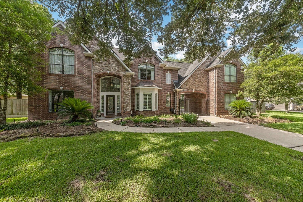 This beautiful home is located in the sought-after Lakes of Rosehill. The driveway leads to a gated porte-cochere with a two car garage, a separate one car garage and additional parking. This home has 5 bedrooms, 4 1/2 baths, 2 fireplaces, office, formal dining, kitchen with island, breakfast area and bar seating, hidden room and Tx basement. The oversized primary bedroom has a separate seating area with a cozy fireplace that leads to the bath. Enjoy the oversized tub, large shower w/dual shower heads, travertine tile, his/her sinks with a seated vanity area! Primary suite opens on to the patio. Separate staircases lead upstairs to a desk area, game room, and a large patio that overlooks the beautiful backyard, spa and pool. 2 bedrooms upstairs have private bathrooms. Home sits on a .67 acre large tree covered lot. Enjoy the resort style living with pool and hot tub activities, grilling or just enjoying the quiet shaded areas around the property. New paint inside and out, recent HVAC