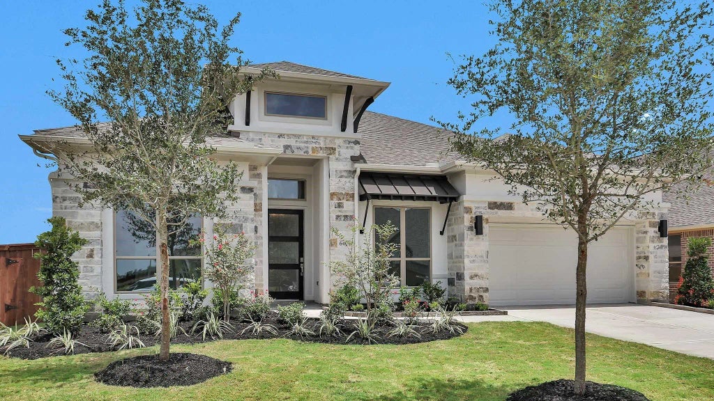 Home office with French doors set entry. Theatre room with French doors off extended entry. Formal dining room flows into open family room with a wood mantel fireplace and wall of windows. Kitchen features corner walk-in pantry, 5-burner gas cooktop and generous island with built-in seating space. Adjoining morning area features wall of windows. Primary suite includes double-door entry to primary bath with dual vanities, freestanding tub, separate glass-shower and two walk-in closets. Guest suite offers private bath. High ceilings and abundant closet space add to this spacious four-bedroom design. Extended covered backyard patio. Mud room off three-car garage.