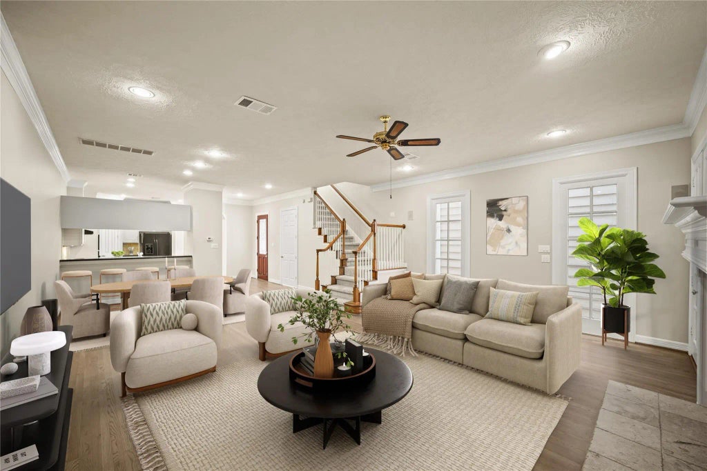 Welcome to this beautiful 3-bed, 2.5-bath townhome offering 3,034 sq ft of elegant living space in the heart of the coveted River Oaks Shopping Center area. Step inside to discover brand new carpet throughout, refinished hardwood floors, and fresh paint that brightens every room. The open-concept living and dining area is perfect for entertaining, featuring French doors that lead to a covered back patio. The kitchen boasts granite countertops, under-cabinet lighting, and comes fully equipped with a refrigerator. A washer and dryer are also included for your convenience. Upstairs, the spacious primary suite offers a true retreat with a large walk-in closet, soaking tub, and a separate shower. A flexible third-floor space provides endless options—home office, gym, media room, or guest quarters. Additional highlights include a two-car garage with tile flooring, a hidden safe and built-ins. Don’t miss this opportunity just steps from top-tier dining, shopping, and entertainment.