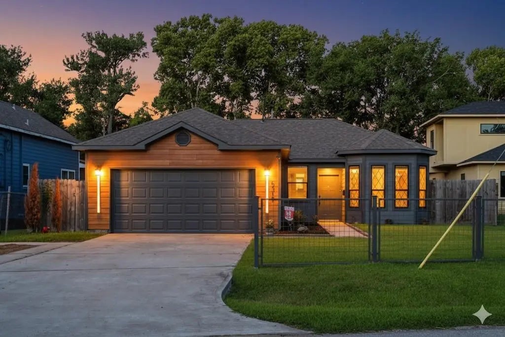 Discover an urban oasis in the heart of Houston, where contemporary design meets unparalleled space. Situated on a sprawling, 11,000 sq ft private lot, this stunning residence offers a rare opportunity for sophisticated living. with a truly expansive backyard, this lot is perfect to expand the home or put in additional units. The exterior features a striking mix of gray siding and warm wood paneling. Inside, an open-concept living area with wood-look laminate floors connects the living, dining, and kitchen spaces. a chef-inspired kitchen anchored by a dramatic, quartz-marbled island and complemented by sleek white cabinetry and top-of-the-line stainless steel appliances. The home's design is both stylish and functional, perfect for comfortable living and entertaining. APPLIANCES + WINE FRIDGE