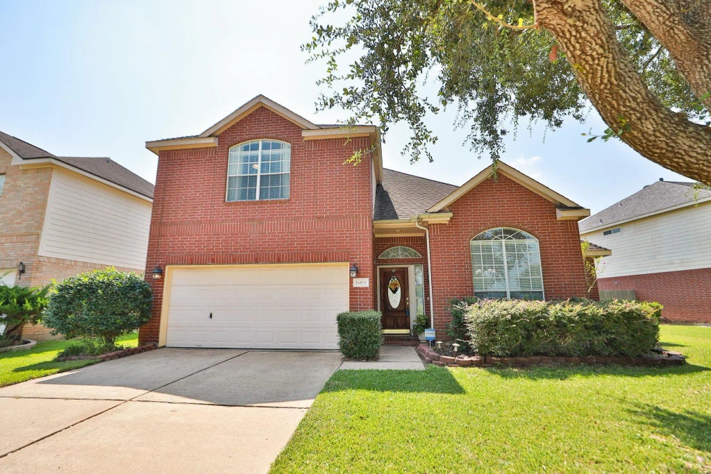Welcome to this beautiful two story brick home that blends spacious design with timeless style. Step inside to soaring ceilings that create an airy, inviting atmosphere, The elegant entry flows into a formal dining room and a bright kitchen featuring crisp white cabinetry and sleek countertops. A sunny breakfast room open to the large family room, where a fireplace and high ceilings make it the heart of the home. The primary suite is conveniently located downstairs and offers a spa like retreat with double vanities, a relaxing jacuzzi tub, and a walk in shower Upstairs a generous game room provides a versatile space for play or entertainment, alongside wo well appointed bedrooms and a full bath with double sinks. Enjoy gatherings or quiet evenings in the spacious backyard, perfect for the outdoor living. This home combines comfort and style in every detail.