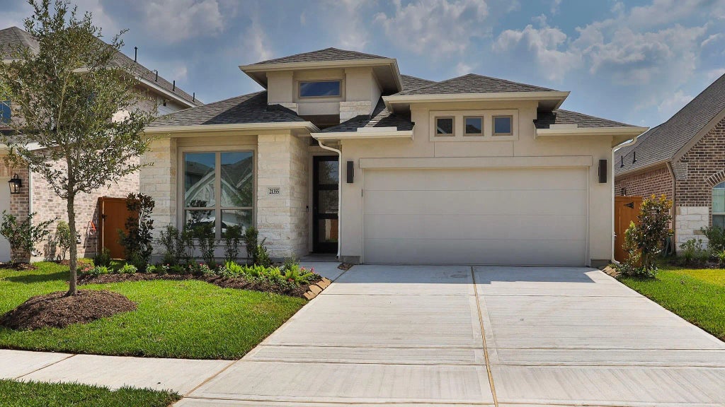 READY FOR MOVE IN!! Extended entry with 12-foot ceiling leads to open kitchen, dining area and family room with 10-foot ceilings throughout. Kitchen features walk-in pantry, generous counter space and inviting island with built-in seating space. Dining area features wall of windows. Family room features a wood mantel fireplace and wall of windows. Primary suite with 10-foot ceiling and wall of windows. Double doors lead to primary bath with dual vanities, garden tub, separate glass-enclosed shower and large walk-in closet with access to utility room. A guest suite with private bath adds to this one-story design. Covered backyard patio and 6-zone sprinkler system. Mud room off two-car garage.