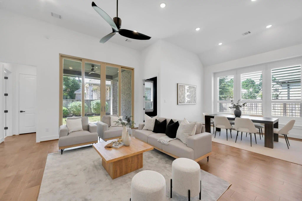 Striking 1-story home set on spacious cul-de-sac lot in Woodforest, featuring 4 beds, 3 full baths and 3-car tandem garage. Through the double-door entry, you’ll find bright open-concept layout with engineered hardwood floors, soaring 13' ceilings, recessed lighting and 4' white wood shutters throughout. Island kitchen boasts built-in dry bar and abundant cabinetry that flows seamlessly into the dining area, while the living room showcases corner fireplace and 10' California-style sliding glass doors opening to outdoors. Private study tucked at the back of the home. Master suite offers bay windows and spa-like bath w/dual vanities, oversized shower, freestanding tub and direct access to the utility room through the walk-in closet. Secondary bedrooms include one with an ensuite bath and two sharing Hollywood bath. Aeratron fans in every bedroom. Covered patio and backyard retreat are complemented by modern upgrades including 13kW Enphase solar system and 24kW Generac backup generator.