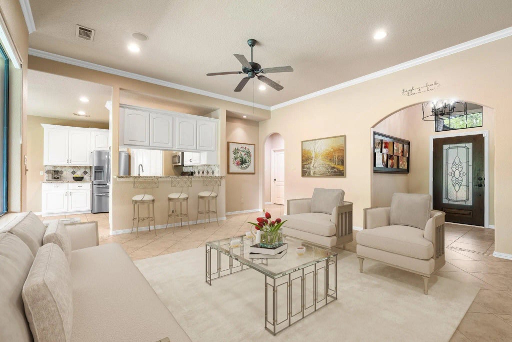 This custom-designed 1 story home offers the perfect blend of comfort, elegance, & scenic charm. One is greeted with a lushly landscaped front yard and the iron fenced backyard not only frames the view beautifully but also offers a safe space for pets or children to play. This residence provides stunning, uninterrupted views of the fairway & lake, making every day feel like a peaceful retreat. Inside, the home features a thoughtful, open-concept layout w/ 3 spacious bedrooms & 2 baths. Natural light floods the living spaces, highlighting quality finishes and a seamless flow ideal for both quiet evenings & lively gatherings. The kitchen opens to the living & dining areas, creating a bright, connected space perfect for entertaining or relaxing w/ family. Step outside to the covered back patio, complete with an extendable awning—perfect for enjoying the view. This home captures the best of lake community living w/a serene setting & easy access to the amenities of Walden. *Generator