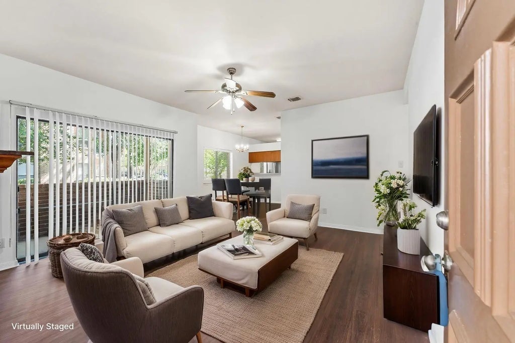 Beautifully updated 1st-floor condo with high ceilings, an open floor plan, and cozy wood-burning fireplace. Luxury vinyl plank flooring throughout, quartz countertops, and fresh paint make this home move-in ready. The kitchen includes a nearby laundry room for convenience. The spacious primary bedroom features a large walk-in closet. Enjoy your private patio with exterior storage—perfect for relaxing outdoors. Refrigerator, washer, and dryer included. One covered parking spot plus ample guest parking. HOA dues cover water, trash service, exterior maintenance, parking areas and limited repair to communal property. Located close to The Woodlands Town Center, I-45, parks, trails, shopping, and dining. Zone to The Woodlands Schools