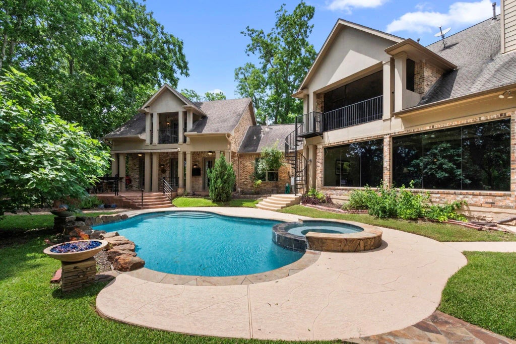 Nestled on a 1.74-acre WOODED LOT in the prestigious Gated Community of Weston Lakes, this remarkable 4-Bedroom estate offers breathtaking BRAZOS RIVER VIEWS. A long private drive leads to an elegant home featuring TWO KITCHENS and an impressive GUEST SUITE. The main Kitchen boasts premium granite countertops, glass-front cabinets, and top of line appliances. The Primary Suite showcases tile floors and serene Backyard views. Upstairs includes 2 Bedrooms, a Media/Game room, and a spacious screened-in balcony overlooking the pool and Brazos River. A standout feature is the private 1.5-story GUEST SUITE, offering a wood-burning fireplace, an upstairs loft with a balcony, and direct access to the second Kitchen, complete with floor-to-ceiling shelving, a gas range, and laundry area. The suite also provides easy access to the pool/spa, and back patio. Additional features include a PRIVATE WELL for yard irrigation and pool replenishment. Enjoy top-tier community amenities and LOW TAX RATE.
