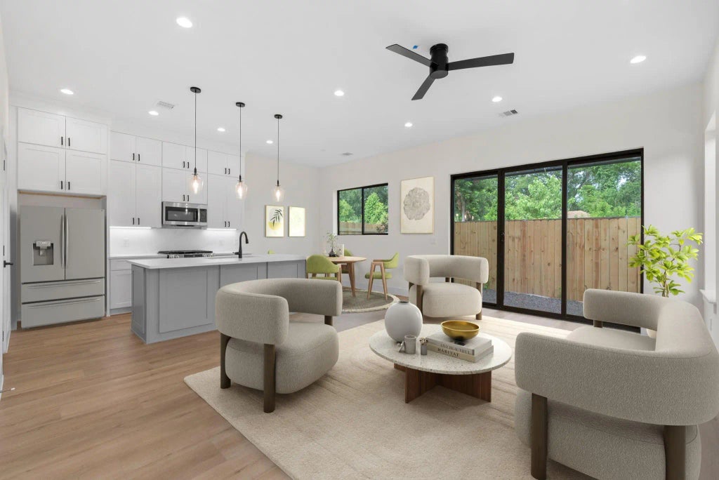 Experience the rare luxury of first-floor living in this stunning new construction home located in the gated community of Ocean Estates in Acres Homes. This home features soaring 10-foot ceilings throughout and an open-concept living, kitchen, and dining area that flows seamlessly to a low-maintenance backyard with gravel landscaping and a covered awning. The chef’s kitchen boasts floor-to-ceiling custom cabinetry, sleek quartz countertops with matching backsplash, under-cabinet LED lighting, and 30” GE gas range. A convenient half bath for guests completes the 1st floor. Upstairs, all 3 bedrooms have generously sized closets with custom shelving, and the primary suite impresses with an expansive walk-in closet. The spa-like primary bath features a soaking tub, shower with luxury tile, built-in bench & niche, and premium Delta fixtures. Laundry is also upstairs for convenience. Community amenities include gated access, guest parking, a dog park, and a spacious 28-foot private drive