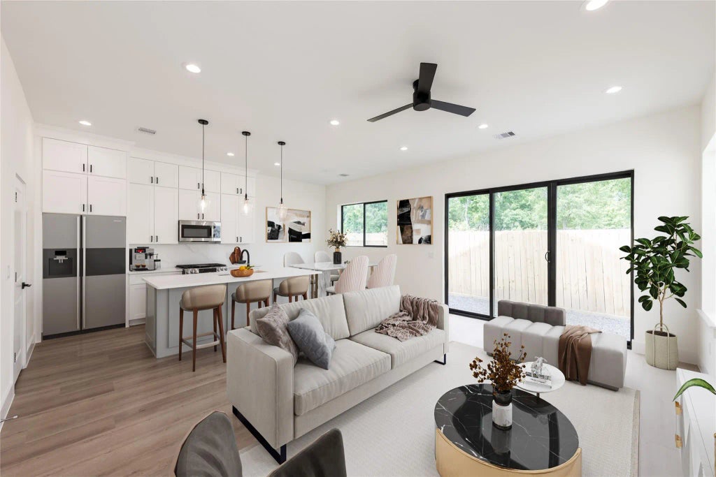 Experience the rare luxury of first-floor living in this stunning new construction home located in the gated community of Ocean Estates in Acres Homes. This home features soaring 10-foot ceilings throughout and an open-concept living, kitchen, and dining area that flows seamlessly to a low-maintenance backyard with gravel landscaping and a covered awning. The chef’s kitchen boasts floor-to-ceiling custom cabinetry, sleek quartz countertops with matching backsplash, under-cabinet LED lighting, and 30” GE gas range. A convenient half bath for guests completes the 1st floor. Upstairs, all 3 bedrooms have generously sized closets with custom shelving, and the primary suite impresses with an expansive walk-in closet. The spa-like primary bath features a soaking tub, shower with luxury tile, built-in bench & niche, and premium Delta fixtures. Laundry is also upstairs for convenience. Community amenities include gated access, guest parking, a dog park, and a spacious 28-foot private driveway.