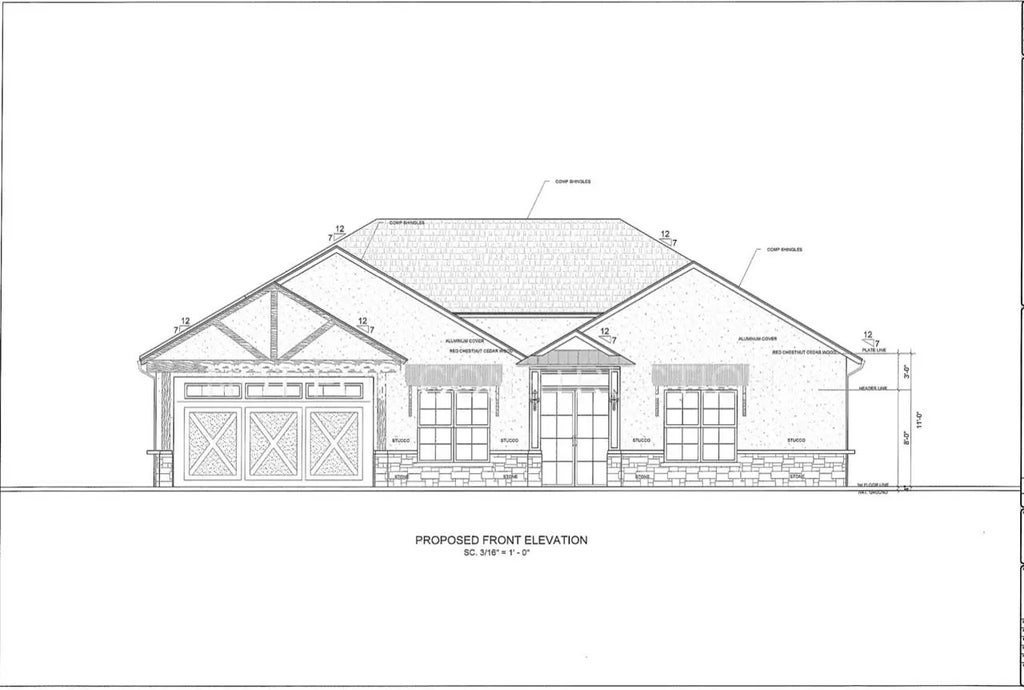 The one-story modern farmhouse is currently under construction on one of the largest lots in the area. The house sells as-is (in its current state), so the future owner can customize and add finishes according to their preference. The home is designed to have three or four bedrooms, three full bathrooms, a principal bathroom with a stand-alone bathtub, and a large dressing room. The open concept kitchen has a large island, an area for a wine cellar in the dining room, a large breakfast room, two fireplaces (interior and exterior), an outside kitchen, and wiring for a smart home (electric blinds, smart lighting, cameras, etc). The windows (by Window World) have different opening options and energy efficiency. It features 11', 14', and an impressive 24' ceiling in the family room. Property can also be completed and finished at a different price.