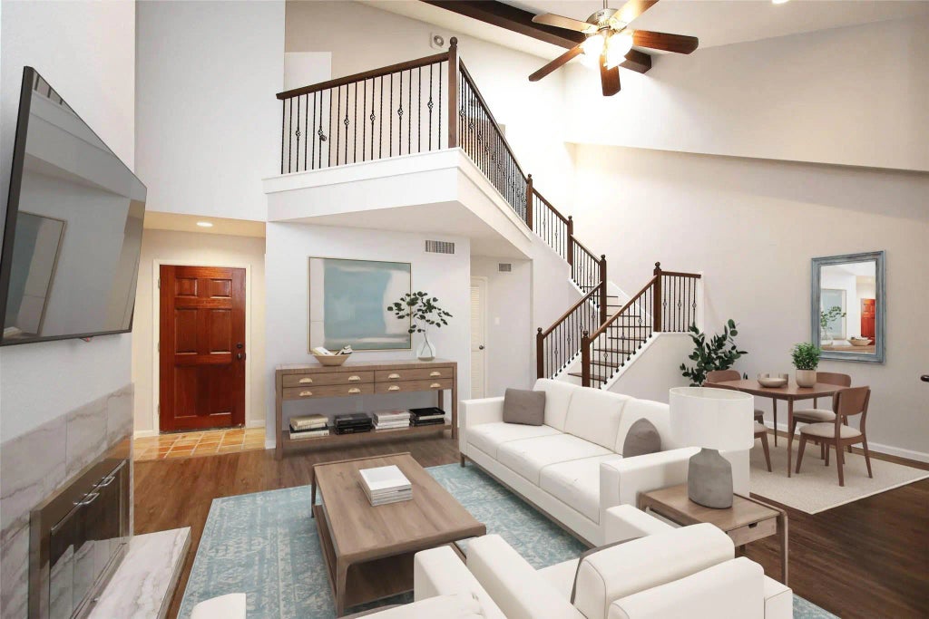 Welcome to this beautifully updated townhome in a gated community with video surveillance! You'll love the airy great room with soaring ceilings, rich wide plank floors, and a cozy wood-burning fireplace. The kitchen features granite countertops, stainless steel appliances, and comes complete with a 2023 ss side-by-side refrigerator with ice and water in the door. Both bedrooms offer large walk-in closets, and the bathrooms have been stylishly updated. The loft at the top of the stairs is perfect for a home office. No carpet in the home, neutral paint throughout make it move-in ready. Washer and dryer included! Step outside to your private covered patio—great for grilling or relaxing. Enjoy the community pool and garden space. Conveniently located near Beltway 8, I-10, Memorial City Mall, and City Centre.