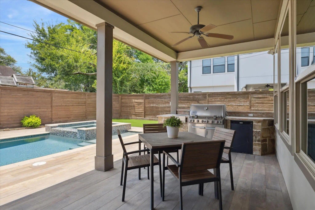 Located mid-block in desirable Oak Forest, this beautiful home features an open floor plan with 10' ceilings on the first floor. Home includes 4-5 bedrooms and 4 full baths, with solid oak flooring and neutral paint tones throughout. The main floor includes a versatile study that can double as a fifth bedroom, with a nearby full bath. The thoughtful layout includes a central open kitchen and family room, featuring a gas cooktop, double ovens, and a spacious island; ideal for daily living and entertaining. The butler’s pantry, between the kitchen and dining room, provides extra serving space, cabinetry, and a wine fridge. A mudroom connects the garage to the entry hall at the home’s center. Upstairs, find 4 bedrooms, a game room, utility room with sink, and a study nook with built-in desk; perfect for homework or remote work. The backyard oasis boasts a sparkling pool, hot tub, covered patio, outdoor kitchen, and spacious turfed area; ideal for play or entertaining.