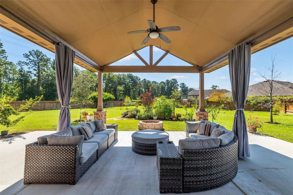 Tucked away on a quiet cul-de-sac, this beautifully updated one-story sits on an expansive ½+ acre lot with no rear neighbors, offering privacy and space to enjoy. Inside, the open-concept floorplan has stylish neutral tones throughout, with updated LVP flooring and a renovated kitchen featuring Taj Mahal Quartzite countertops, soft-close cabinetry, a dry bar, and an extended island with breakfast bar seating—perfect for hosting family and friends. In the front, three bedrooms share a full bath, while a flex room behind the kitchen offers space for a home office, playroom, or guest retreat. The private primary suite is set at the back of the home, complete with serene views of the backyard. Outside is an outdoor haven complete with a large covered patio, soothing water feature, fire pit, storage shed, raised garden beds, and massive lot with ample room for a pool and/or a backyard golf masterpiece. Zoned to The Woodlands HS and just minutes from top-tier shopping and dining.