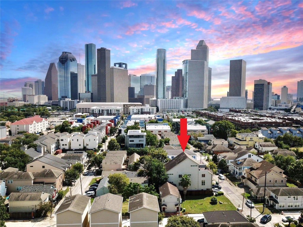 Unique duplex style setup, perfect for roommates or extended families, or even investors. Home is 3 bedrooms & 3 baths, but divided into a 1st floor studio apt and an upstairs 2/2 home. Downstairs apt is a private full 1 bedroom 1 bath unit with rear entrance, which was recently leased for 1,700 a month. Main home is on floors 2-4, which features 2 bedrooms/2 full baths, plus an expansive rooftop terrace with amazing downtown views. Main home was recently leased for 3,400 a month. It features a 2 story living room, a 3rd floor office area, and a primary suite on the 3rd floor. 1st floor apt has a separate washer/dryer area in the garage. Home has a tandem 2 car garage, with EV charging capabilities. Entire property was currently used as an investment, but could easily be used to live in 1 unit and rent out the other. Property comes with ALL appliances and turn-key for an investor, or owner-occupant. Extremely walkable to shops, restaurants, and parks, including Buffalo Bayou Park.