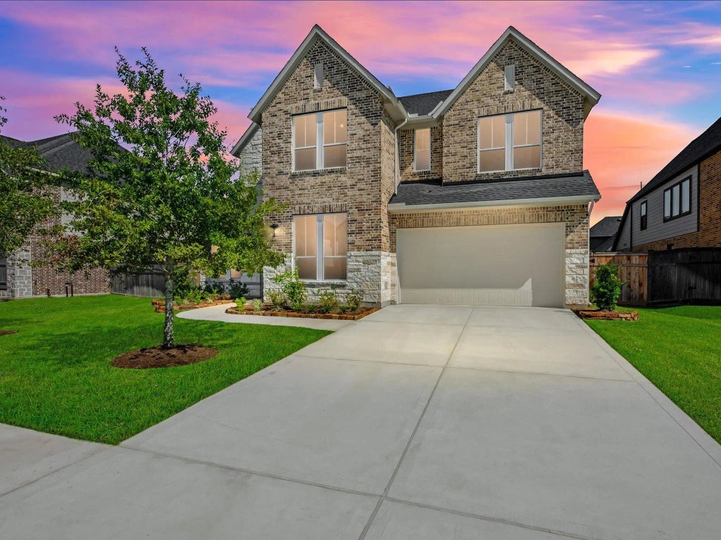 Immerse yourself in the charm of this two-story home with an inviting mahogany front door. The open-concept design is perfect for gatherings and features a convenient athome office off the foyer. The gourmet kitchen boasts GE stainless steel appliances, a 36' gas cooktop, Groveland Maple Summer Wheat cabinetry, Calacatta Abezzo quartz countertops, and an island. The primary bath offers a freestanding tub, Carrara Miksa quartz countertops,Groveland Maple Summer Wheat cabinetry, and a spacious walk-in closet. Enjoy game room and 3 additional bedrooms upstairs and unwind on the extended covered patio connected to the dining room.