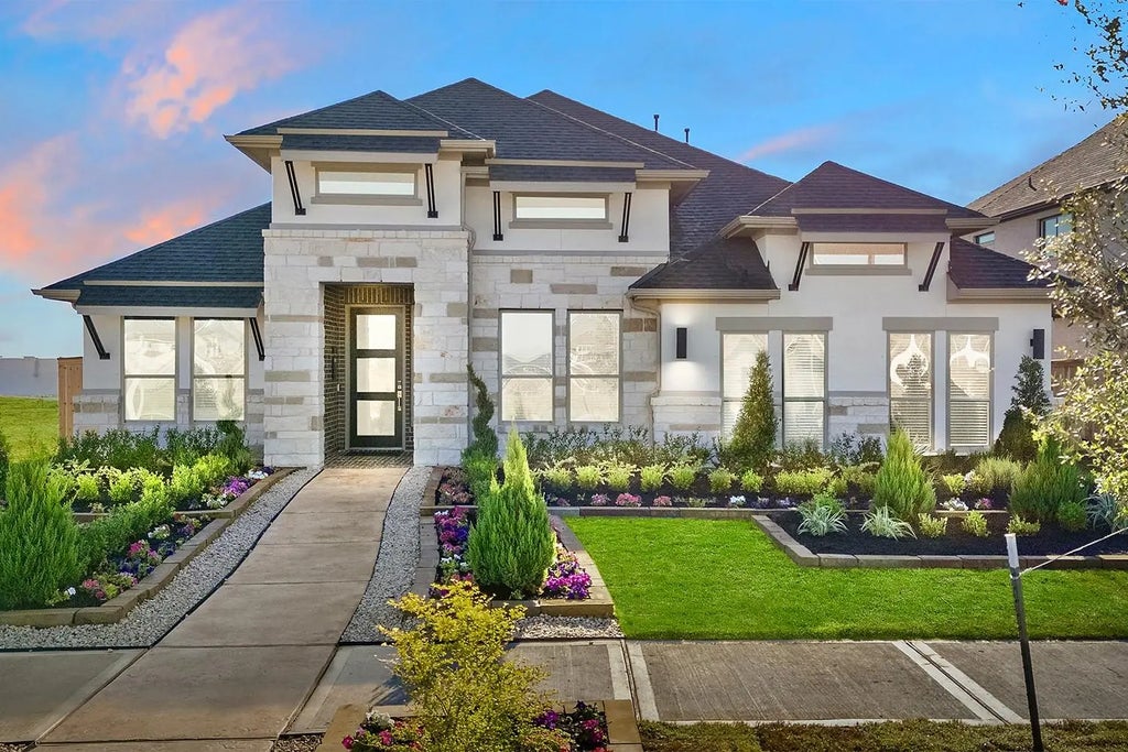 This stunning single-story home features soaring ceilings, a spacious game room, a serene office, and a luxurious primary bedroom. The chef’s kitchen includes a grand island and ample storage, blending style and convenience.