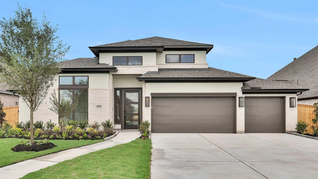 READY FOR MOVE-IN!! - Home office with French doors set at entry with 12-foot ceiling. Extended entry leads to open family room, dining area and kitchen with 17-foot ceilings throughout. Family room features wall of windows and fireplace. Kitchen features generous counter space, walk-in pantry and island with built-in seating space. Primary suite with wall of windows. Double doors lead to primary bath with 11-foot ceiling, dual vanities, garden tub, separate glass-enclosed shower and two walk-in closets. Game room with French doors features wall of windows. A guest suite plus abundant closet and storage space add to this open one-story design. Covered backyard patio with 16-foot ceiling. Mud room off three-car garage.