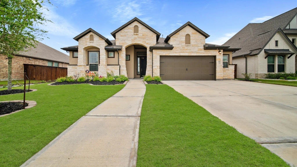 LAKEFRONT HOME IN MERIDIANA MASTER PLANNED COMMUNITY! This exquisite Chesmar home is a single-story property combining limestone and brick, offering 4 bedrooms, 2.5 bathrooms, plus a study/office. It boasts an open floor plan with abundant natural lighting and lake views. The office/study features elegant French doors. The kitchen is equipped with a large island to cater to your entertaining needs, a gourmet kitchen upgrade package with granite countertops consistent throughout the residence. The kitchen boasts a backsplash that extends to the ceiling, cabinetry accented with under-cabinet lighting, and high-end appliances. The primary suite includes a dual-person shower with seating and a luxurious soaker tub. The property's curb appeal is heightened by an expanded garage and driveway, an irrigation system, and a covered patio with a gas connection. Enjoy the serene lake views from the backyard, framed by a wrought iron fence. This dream home comes with $39,950.00 in upgrades.