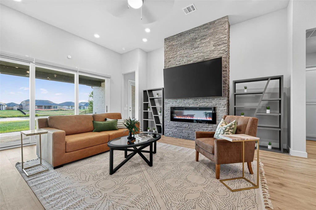 Elegant design meets everyday comfort in this 55+ active community The Juniper plan lakefront home with thoughtful upgrades throughout. Inside, soaring ceilings, crown molding, and luxury vinyl plank floors create a warm and refined backdrop. The open-concept kitchen impresses with double-stacked shaker cabinets, granite countertop, GE Profile appliances, soft-close drawers, and dual pantries designed for both daily living and entertaining. Gather in the spacious dining and family room anchored by a stone-accented fireplace. The primary suite offers new carpet, dual walk-in closets with custom cabinetry, and a spa-like bath featuring granite vanities and an oversized shower. Secondary bedrooms include details like French closet doors and a statement chandelier. A covered patio with decorative concrete overlooks the lake view from the backyard. A 3-car tandem garage with epoxy floors and a whole-home generator complete this exceptional property. OPEN HOUSE DAILY-CALL OR TEXT FOR TIMES