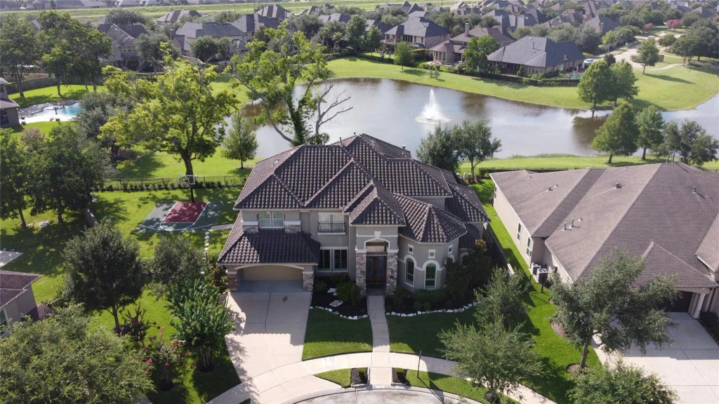 Stunning cul-de-sac home with lake view! Stucco and stone exterior with classic clay tile roof. Richly stained, updated front door opens to a spacious layout ideal for family living and entertaining. Kitchen features double ovens, gas cooktop, refrigerator included, and opens to family room. Private study at front of home. Two first-floor bedroom suites are split for privacy—perfect for guests or multi-gen living. Upstairs gameroom plus 3 additional bedrooms and baths. Backyard is an entertainer’s dream with outdoor kitchen, basketball court, and lake view with timed spray feature. 3-car tandem garage. Community amenities include golf course, pool, splash pad, tennis & pickleball courts. Don't miss the opportunity to make this your Home Sweet Home!