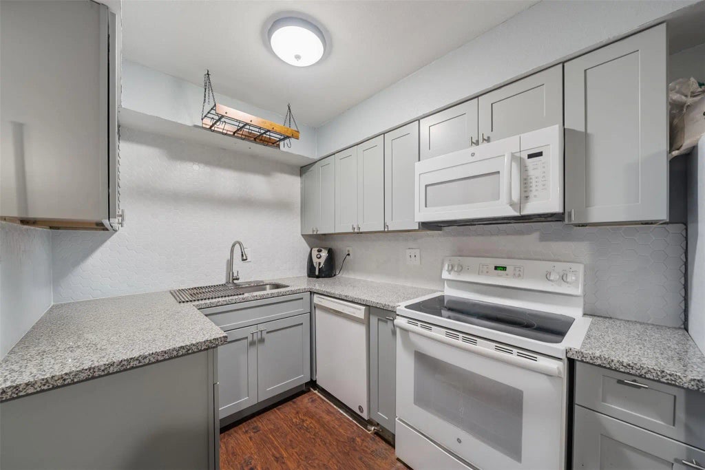 Charming 2-story condo in a gated community, featuring carport parking, a fenced back patio, brick curb appeal with front yard space, 1st floor living area, updated bathrooms, upgraded kitchen, and both bedrooms up with their own full baths! Inside, you'll find wood-vinyl plank flooring, neutral paint, granite in the kitchen with a fridge included, ceiling fans, utility connections, and a large living room! Located with easy access to I-69/Southwest Fwy, Chinatown, Beltway 8, The Galleria, I-610, numerous eateries, and more!