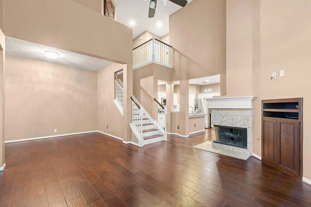 Gorgeous Townhome in Alden Bridge of The Woodlands. The home features high ceilings, soaring windows and tons of natural light, and hardwood floors throughout the home. The first floor includes an open plan living / dining / kitchen area, en-suite primary bedroom with large walk-in closet, study / home office and utility room. Two additional bedrooms and a 10 x 10 flex/storage room are located on the second floor. The kitchen features granite countertops and includes a Refrigerator in addition to the standard appliances. The Backyard features a wrap around deck which makes for low maintenance of the yard.