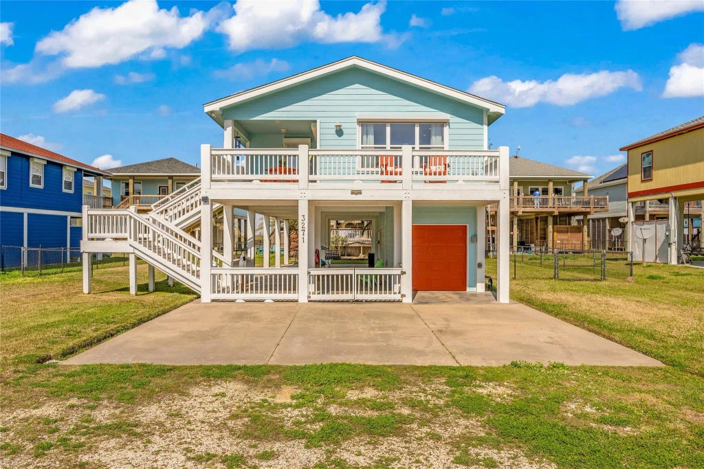Welcome to 3271 Pirates Cove in the sought after Lafitte's Landing addition! This meticulously maintained beach home is sold fully furnished w/a Golf cart! STR or vacation/primary home ready! 2/2 home boasts beach and Bay views, a large, fenced yard perfect for a pool, storm shutters, a spacious balcony, Juliette balcony and more. Ideal for vacation or short-term rentals, the open floor plan offers a comfortable living space, storage galore and a large kitchen. Grab a cup of coffee & watch the sunrise from your balcony. Below the home, you'll find an outdoor shower, garage, and ample gathering spaces. The roof is only 3 years old , new HVAC & the home has been recently painted ensuring peace of mind. Home sold fully furnished w/a golf cart you just need your beach wear and food. You are just steps to the beach. Don't miss out on this fantastic property with views of the beach and bay!