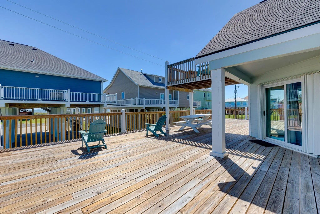 Fantastic investment opportunity! This charming 3-4 bedroom, 2.5 bath beach house is fully fenced and offers an open, bright living area. The spacious living room flows into an upper deck with a separate loft offering breathtaking views. Enjoy a large front porch perfect for sunbathing, with direct access from two bedrooms. The back deck includes an elevator/lift, making it easy to move heavy items upstairs. The generously sized bedrooms offer ample storage, and every window and door is equipped with storm shutters. A large garage provides space for all your water toys, with additional covered parking for multiple vehicles, plus a private outdoor shower. This home also holds great potential as a rental property.