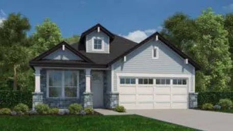 The attractive London plan centers around a large open kitchen, complete with an island. An airy great room—ideal for relaxing and entertaining—is steps away, as is a dining area. The primary suite is secluded toward the back of the home, offering a walk-in closet and a private bath with a walk-in shower. Toward the front of the home, two bedrooms share a full hall bath.