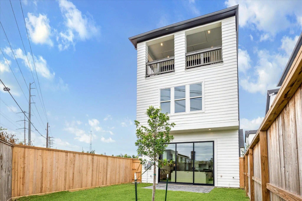 Stunning & unique must-see FIVE BEDROOM home with game room/rooftop terrace with wide unobstructed DOWNTOWN views and very spacious private fenced BACKYARD! First floor living home in the beautiful gated community of Timbergrove Green. Enjoy soaring 12ft ceilings in your living area with epic 10ft glass sliding doors leading from your spacious living room to backyard. Chef's kitchen features SS Bosch appliances, furniture grade high quality cabinets, carrera white marble backsplash, and quartz countertops. Living room boasts custom shelving and built-ins with luxe electric fireplace & accent lighting for a WOW factor. Primary 5 star spalike bath is adorned with real imperial white marble slabs and elegant freestanding tub. One of the secondary bedrooms have a beautiful juliet balcony. Must see in person! Elevator capable.